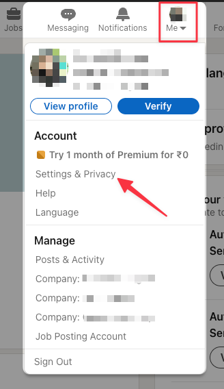 1. Click the Me icon at the top of the LinkedIn homepage and choose Settings and Privacy from the dropdown menu.