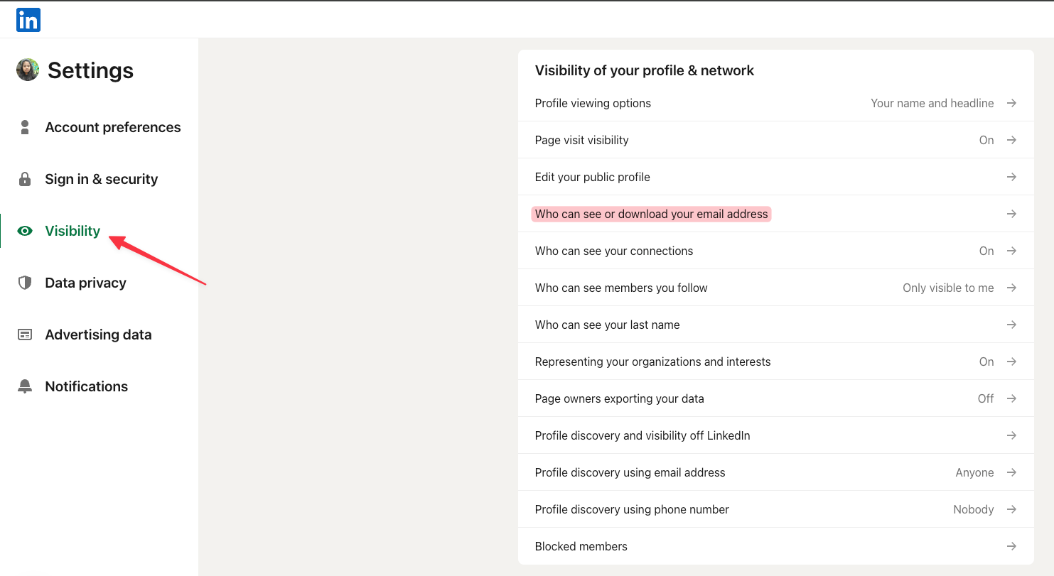To adjust this, go to Settings & Privacy → Visibility → Who can see or download your email address.
