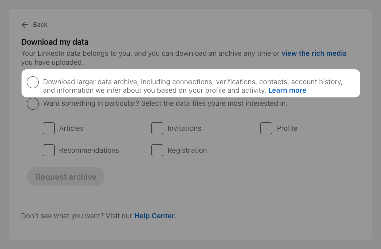 3. Choose “Download larger data archive, including connections, verifications, contacts, account history, and information we infer about you based on your profile and activity.”