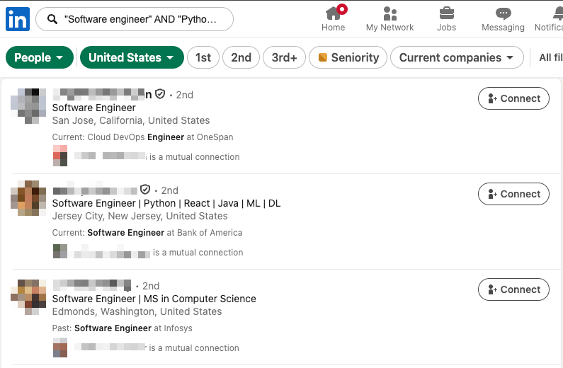 This shows only software engineers with Python expertise while excluding intern profiles.