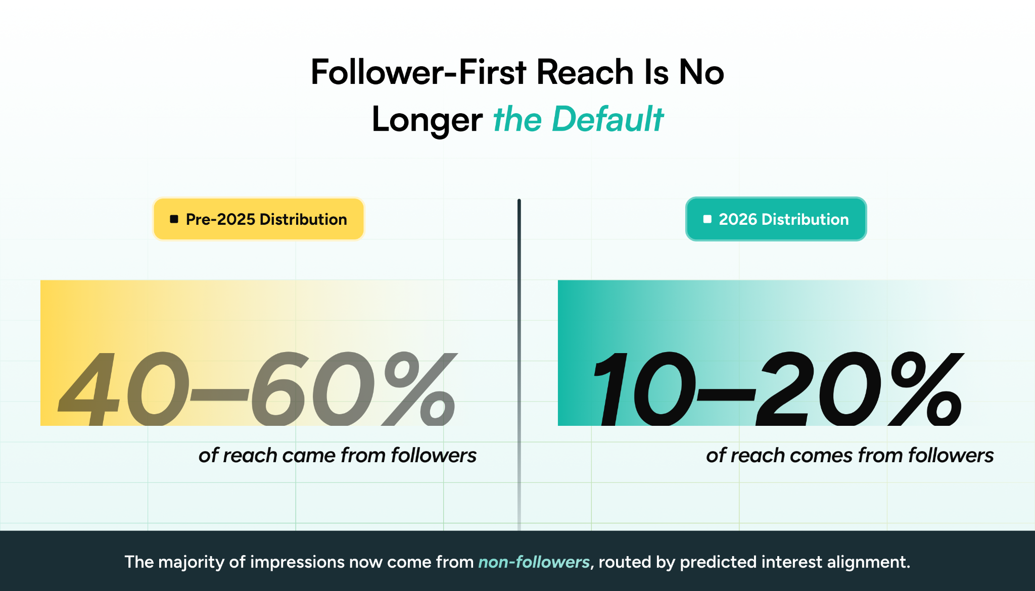 For years, LinkedIn distributed content based on who you were connected to. The logic was simple: post, reach your followers, hope it spreads from there. In 2026, that's no longer the underlying mechanic. The feed now maps users into interest cohorts based on dwell time, saves, engagement history, and topic affinity, then routes content based on predicted relevance, regardless of connection status. Data from the platform shows that follower-first reach has dropped from roughly 40–60% in the pre-2025 era to 10–20% today. The majority of a post's reach now comes from people who don't follow the account at all.