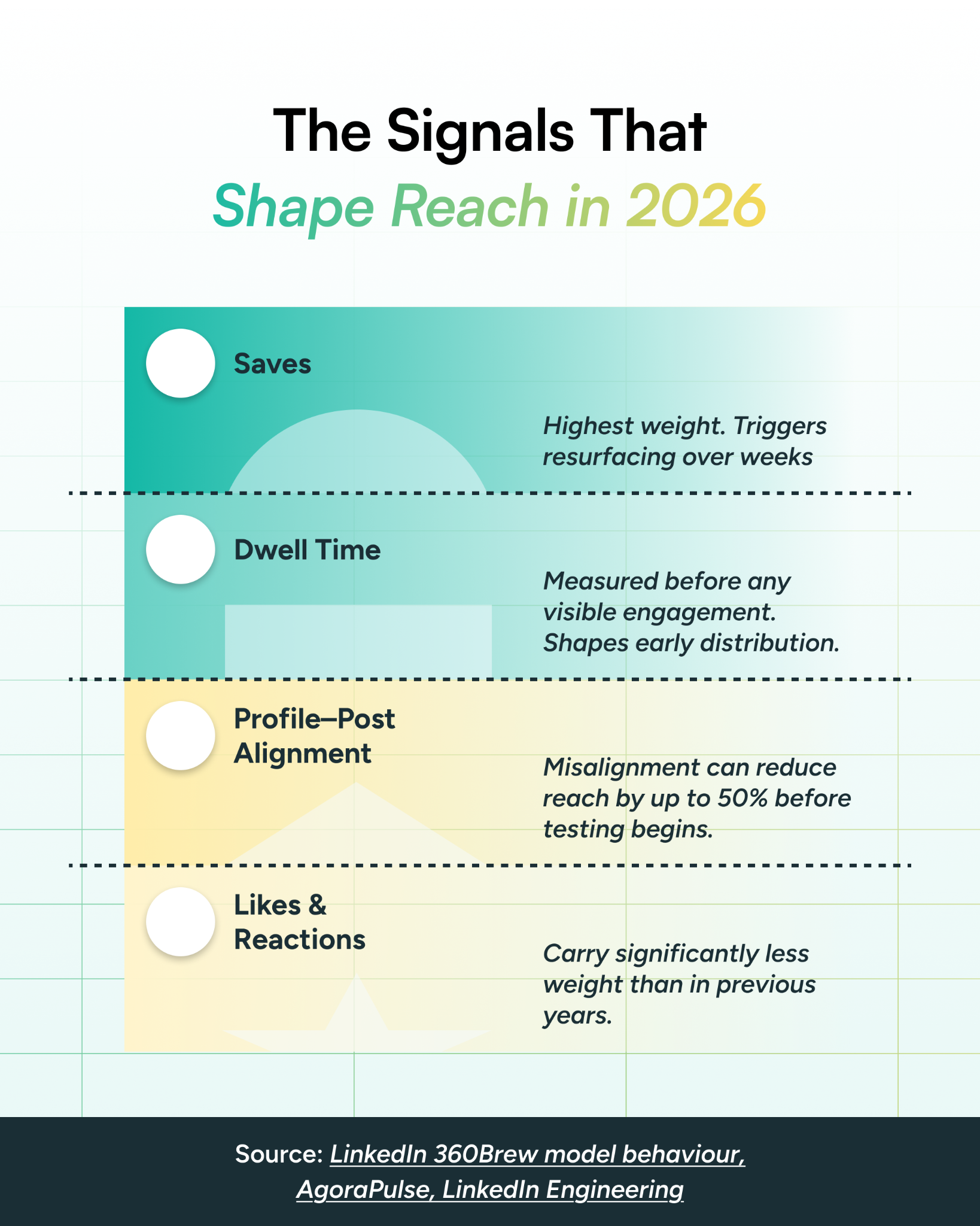 Profile alignment has become a gating mechanism: LinkedIn's model now cross-checks what your profile communicates against what you post, and when the two diverge, distribution weakens before the post is even tested. Reach drops of up to 50% have been observed following poor profile-content alignment.