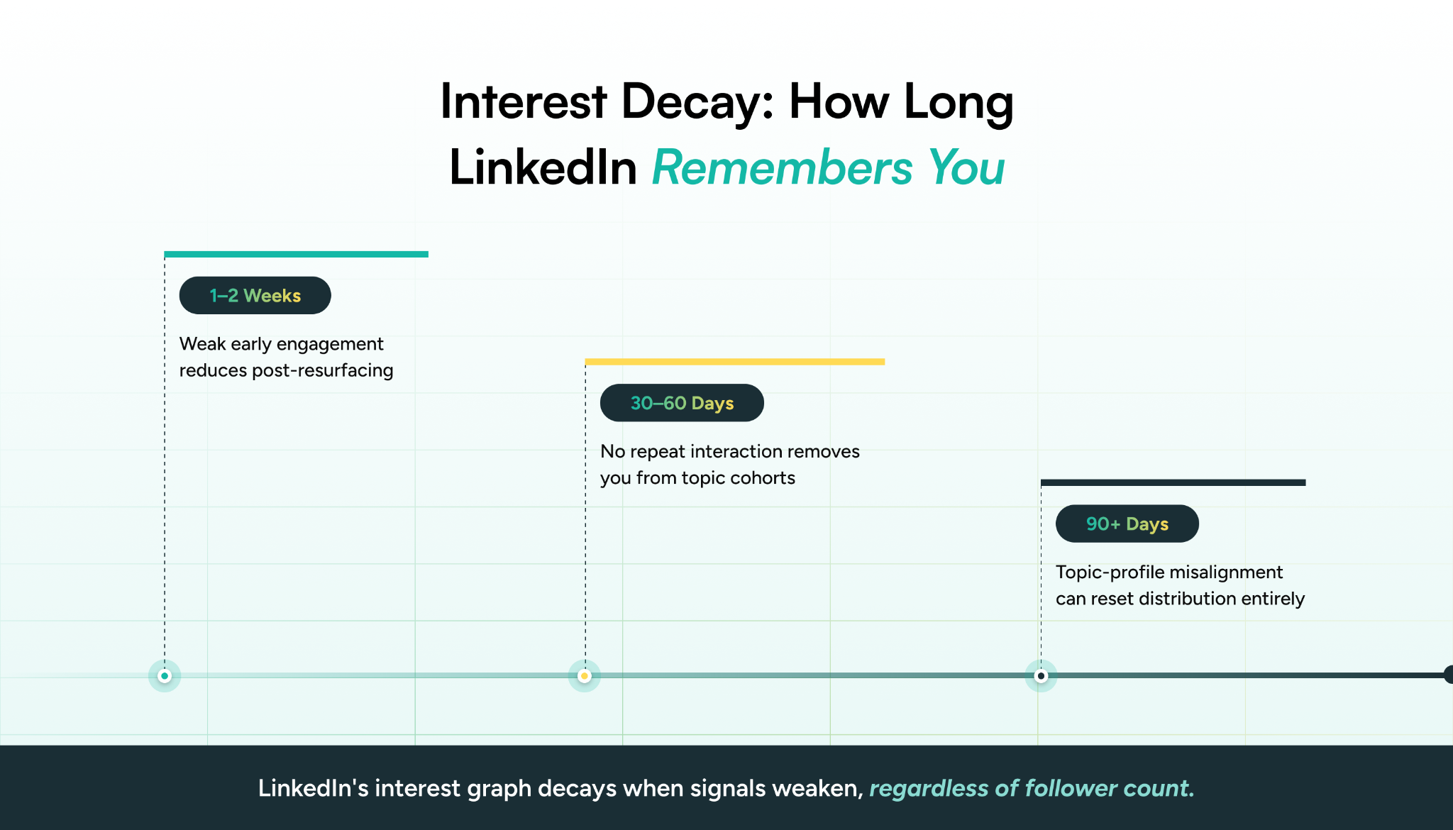 The Spring 2026 report covers all of this in depth, including how 360Brew, LinkedIn's large-scale AI ranking model, processes posts semantically rather than through surface signals, and how interest decay operates on rolling windows where 1-2 weeks of weak early engagement reduces resurfacing, 30-60 days without interaction removes a creator from topic cohorts, and 90+ days of topic-profile misalignment can reset distribution almost entirely.