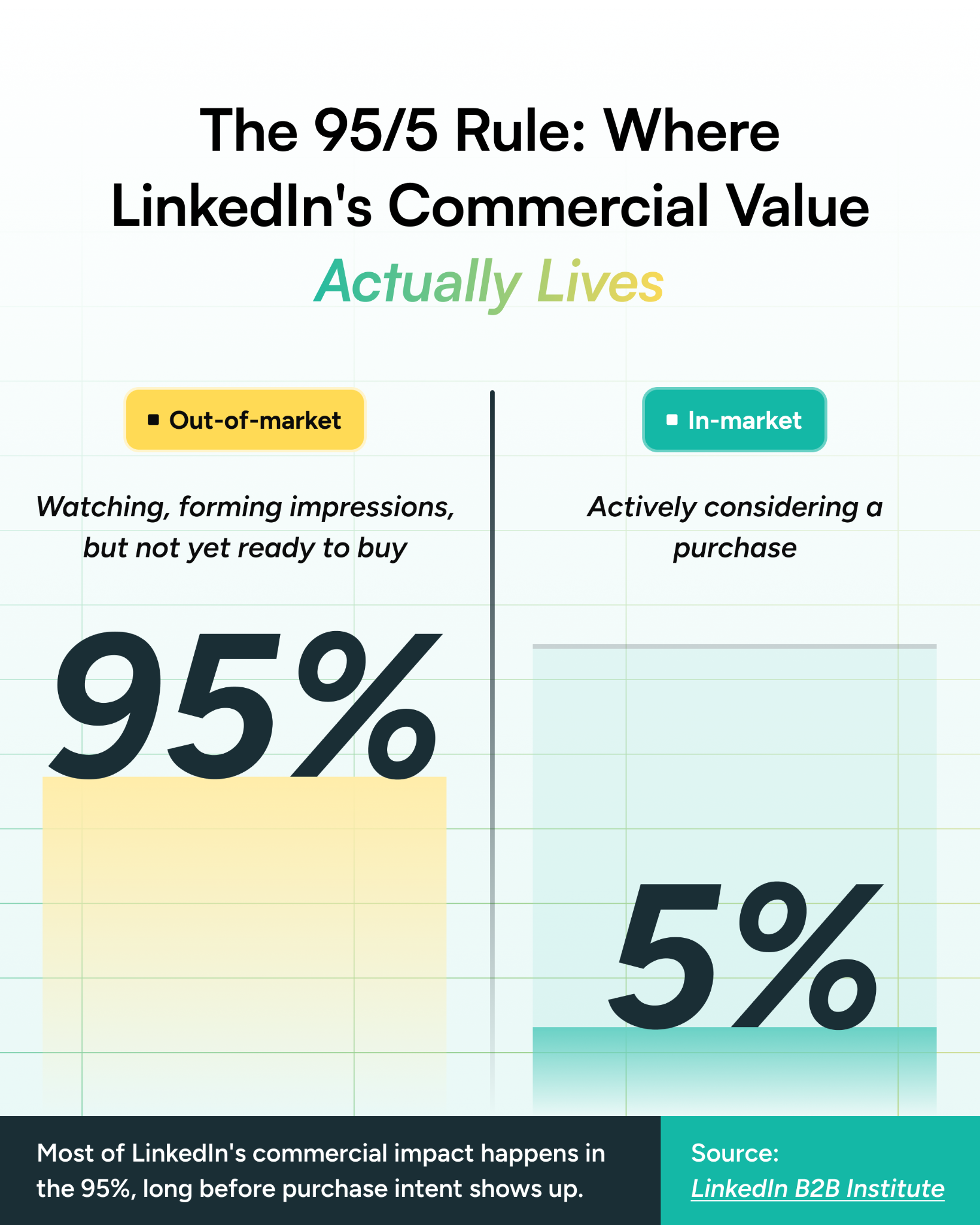 There's also a detailed look at what the data shows about personal profiles versus company pages: a Refine Labs analysis found personal profiles driving 2.75x more impressions and 5x more engagement than the equivalent company page. And there's the commercial layer: how LinkedIn's B2B Institute research on the 95/5 rule reframes what content is actually doing on the platform. Roughly 5% of buyers are in-market at any point, and the other 95% are watching, forming impressions, and building associations long before any purchase intent shows up. Content-influenced revenue is real, but it operates well upstream of where attribution tools are looking.
